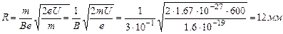 2. Протон, прошедший ускоряющую разность потенциалов U=600В, влетел в однородное магнитное поле с индукцией В=0,3Т и стал двигаться по окружности. Вычислить радиус R окружности. Решение: Работа, совершаемая электрическим полем при прохождении протона ускоряющей разности потенциалов, превращается в кинетическую энергию протона: