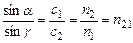 Закон преломления света (2): падающий и преломленный лучи лежат в одной плоскости с перпендикуляром к границе раздела сред, проведенным в точке падения; отношение синуса угла падения к синусу угла преломления равно отношению скорости света в первой среде к скорости света во второй среде. Обозначая Где с – скорость света в вакууме, n1 и n2 –абсолютные показатели преломления первой и второй сред, получим: