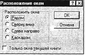 Якщо встановлено прапорець Только окна текущей книги, то команда Расположить упорядковує лише вікна активної робочої книги. Якщо прапорець не встановлено, то команда Расположить упорядковує всі не сховані вікна.
