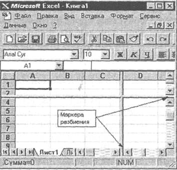 Команда Разбить ділить активне вікно на два чи чотири підвікна. Ця команда дає можливість прокручувати підвікна водночас. Два горизонтальні підвікна завжди матимуть однакові заголовки стовпців; два вертикальні підвікна завжди матимуть однакові заголовки рядків. Команда Удалить разбиение видаляє розбивку в активному вікні. Ця команда доступна лише тоді, коли активне вікно поділене. Подвійне клацання на маркері чи на лінії поділу також вилучає розбивку. Якщо відкрито більше, ніж дев'ять вікон, то наприкінці списку з'являється команда Другие окна. Вибираємо її для перегляду списку всіх відкритих вікон