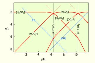 Таким чином ми можемо визначити значення pH для областей переважання кожного із трьох карбонатних розчинних форм H2CO30, HCO3-, CO32-.