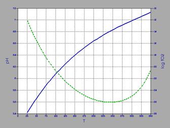 Рис.3. Змiна точки нейтральностi pH i fO2 в залежностi вiд температури