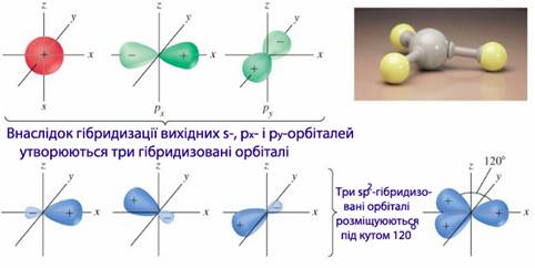 Рисунок 7.8 – Схема sp2-гібридизації атомних орбіталей і плоска трикутна форма молекули, зумовлена sp2-гібридизацією атомних орбіталей