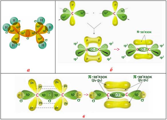 Рисунок 7.16 – Кратність зв’язку між атомами Карбону: а) одинарний s-зв’язок в етані Н3С–СН3; б) подвійний s+p-зв’язок в етилені Н2С=СН2; в) потрійний s+p+p-зв’язок в ацетилені НСºСН