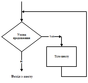 Тут whilе <умова продовження циклу> do є заголовком циклу, <оператор> — його тілом, тілом циклу може бути операторним блоком і містити в собі будь-які оператори: циклу, вибору, присвоєння тощо. Оператор циклу з передумовою виконується за таким алгоритмом. Спочатку обчислюється умова продовження циклу, що записана в його заголовку. Якщо вона істинна, то виконується тіло циклу, інакше виконання циклу припиняється. Після виконання тіла циклу буде знову перевірена умова його продовження. Чергування виконання тіла циклу та перевірки умови продовження триває доти, доки умова не стане хибною. Згідно з синтаксисом оператора while тіло циклу є одним оператором. Для того щоб в циклі виконувалося декілька операторів, їх треба оточити операторними дужками begin...end. Оператору циклу з передумовою відповідає блок-схема.