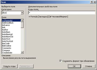 Для створення поля треба виконати команду "Вставка ® Поле". У вікні цієї команди (рис. 9.1) вказують категорію і код поля. Щоб додати до коду ключі та інші параметри, треба натиснути кнопку "Параметры" і закрити вікно, натиснувши кнопку "ОК". Для створення поля можна також натиснути комбінацію клавіш <Ctrl+F9>, щоб вставити порожні дужки, а потім ввести з клавіатури відповідні інструкції. Щоб відобразити значення або код поля, треба виділити це поле і натиснути комбінацію клавіш <Shift+F9>. Щоб відобразити значення або коди усіх полів документа, треба натиснути комбінацію клавіш <Аlt+F9>. Можна також виконати команду "Сервис® Параметры", а потім на вкладці "Вид" вікна цієї команди вимкнути прапорець "Коды полей ". Для відновлення значення поля треба виділити його і натиснути клавішу <F9>. Щоб відновити значення всіх полів документа, треба виділити весь документ командою "Правка® Выделить все" і натиснути клавішу <F9>. Щоб значення всіх полів відновлялися автоматично перед друкуванням, треба виконати команду "Сервис® Параметры", а потім у вікні цієї команди на вкладці "Печать " встановити прапорець "Обновлять поля". Щоб перетворити поле на звичайний текст і в такий спосіб зафіксувати його значення, треба натиснути комбінацію клавіш <Ctrl+Shift+F9>.