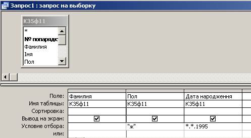 Наприклад, в базі даних коледж треба в таблиці № групи відібрати всіх дівчат 1995 року народження. Бланк запиту буде виглядати так:
