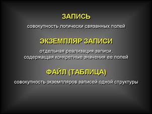 Экземпляр записи – отдельная реализация записи, содержащая конкретные значения ее полей. Файл (таблица) – совокупность экземпляров записей одной структуры.