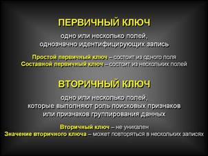 Первичный ключ (ПК) – это одно или несколько полей, однозначно идентифицирующих запись. Если первичный ключ состоит из одного поля, он называется простым, если из нескольких полей – составным ключом. Вторичный ключ (ВК) – это одно или несколько полей, которые выполняют роль поисковых или группировочных признаков. В отличие от первичного, значение вторичного ключа может повторяться в нескольких записях файла, то есть он не является уникальным. Если по значению первичного ключа может быть найден один единственный экземпляр записи, то по вторичному – несколько.