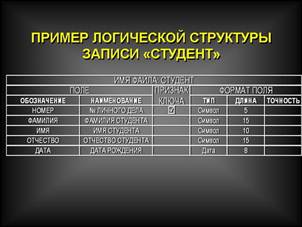 – имя, например, Фамилия, Имя, Отчество, Дата рождения; – тип, например, символьный, числовой, календарный; – длина, например, 15 байт, причем будет определяться максимально возможным количеством символов; – точность для числовых данных, например два десятичных знака для отображения дробной части числа,