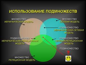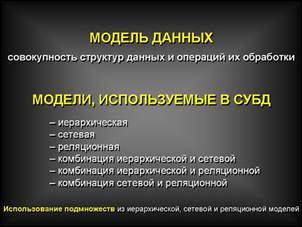 Ядром любой базы данных является модель данных. Модель данных представляет собой множество структур данных, ограничений целостности и операций манипулирования данными. С помощью модели данных могут быть представлены объекты предметной области и взаимосвязи между ними. Модель данных – совокупность структур данных и операций их обработки. СУБД основывается на использовании иерархической, сетевой или реляционной модели, на комбинации этих моделей или на некотором их подмножестве.