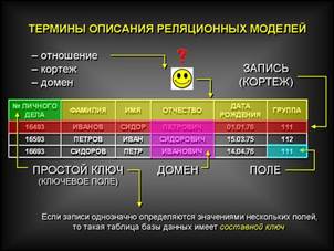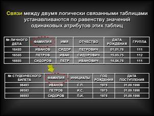 Отношения представлены в виде таблиц, строки которых соответствуют записям (кортежам), а столбцы полям, атрибутам отношений (доменам). Поле, каждое значение которого однозначно определяет соответствующую запись, называется простым ключом (ключевым полем). Если записи однозначно определяются значениями нескольких полей, то такая таблица базы данных имеет составной ключ. В примере, показанном на слайде, ключевым полем таблицы является «№ личного дела».