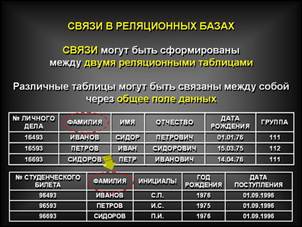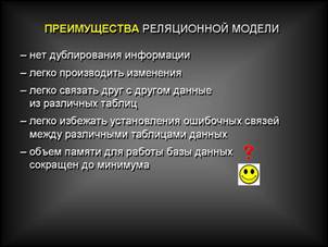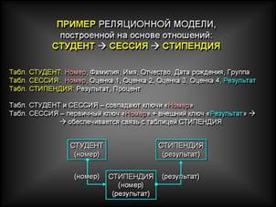 – удается избежать дублирования информации. Все необходимые данные можно хранить только в одной таблице. Так, например, нет необходимости в таблице СЕССИЯ хранить номер группы каждого студента, сдающего экзамены, достаточно задать связь с таблицей СТУДЕНТ; – в реляционных базах данных легко производить изменения. Если в таблице СЕССИЯ изменить какие-нибудь значения, то правильная информация автоматически будет связана с другими таблицами, ссылающимися на первую (например, таблица СТИПЕНДИЯ); – в нереляционных базах данных сложно передать все имеющиеся зависимости, т.е. связать друг с другом данные из различных таблиц. Реляционная база данных выполняет все эти действия автоматически; – в реляционных базах данных удается легко избежать установления ошибочных связей между различными таблицами данных, а необходимый объем памяти сокращен до минимума.