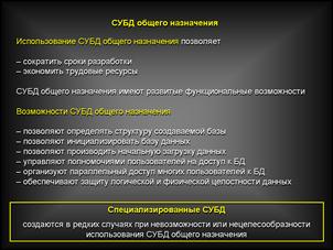Специализированные СУБД создаются в редких случаях при невозможности или нецелесообразности использования СУБД общего назначения.