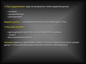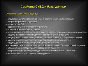 СУБД обеспечивает программные средства для создания, загрузки, запроса и обновления данных, контролирует действия, связанные с вводом-выводом данных, решает вопросы совместного их использования и защиты.