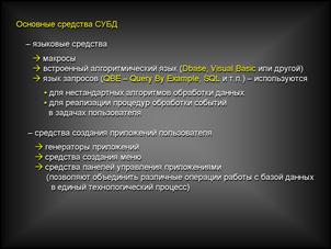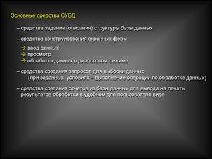 Основными средствами СУБД являются: – средства задания (описания) структуры базы данных – средства конструирования экранных форм, предназначенных для ввода данных, просмотра и их обработки в диалоговом режиме; – средства создания запросов для выборки данных при заданных условиях, а также выполнения операций по их обработке; – средства создания отчетов из базы данных для вывода на печать результатов обработки в удобном для пользователя виде;
