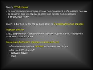 В сети с файловым сервером база данных может размещаться на сервере. При этом СУБД загружается и осуществляет обработку данных базы на рабочих станциях пользователей. Концепция файлового сервера в локальной сети обеспечивается рядом сетевых операционных систем. Наиболее популярными являются Microsoft Windows NT и NetWare Novell.
