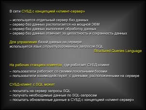 СУБД-клиент, в которой поддерживается SQL, в полном объеме может посылать на сервер запросы SQL, получать необходимые данные, а также посылать обновленные данные.