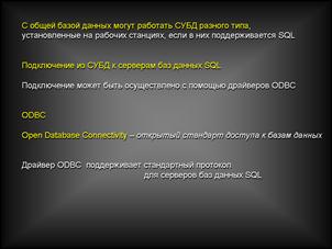 Подключение из СУБД к серверам баз данных SQL может быть осуществлено с помощью драйверов ODBC: ODBC (Open Database Connectivity –открытый стандарт доступа к базам данных) поддерживает стандартный протокол для серверов баз данных SQL.