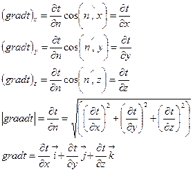 Градиент температур – это вектор направленный к изотермической поверхности в сторону возрастания температур и равный численно производной от температуры по этому направлению. Часто - также называют градиентом температур. В общем случае вектор градиента температур расположен в пространстве произвольно и его можно разложить по составляющим в направлении оси координат: