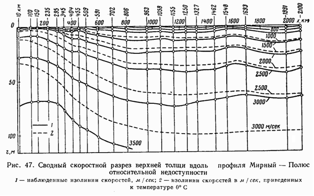 С целью определения строения льда использовались рефрагированные волны. Обработка велась способом Чибисова.. Однако, в то время отсутствовали вычислительные машины и. чтобы упростить вычисления, Кондратьевым О.К был предложен эмпирический способ обработки годографа рефрагированной волны. Авторы исследовали точность предложенного способа. На рис. 2.20 дается сопоставление величины ошибок определения скоростного разреза способом Герглотца–Вихерта–Чибисова и способом Кондратьева. Если истинными считать данные сейсмокаротажа, то максимальная ошибка результатов применения способа Герглотца-Вихерта составляет 80 м/с (2%), а способа Кондратьева 200 м/с (5%).