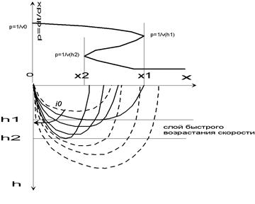 Необходимыми и достаточными условиями для применения формулы Герглотца-Вихерта-Чибисова являются следующие. X(p) – непрерывна, X(1/v0) = 0 X (p) - имеет производную, которая конечна и имеет конечное число точек разрыва. При выводе формулы Герглотца-Вихерта-Чибисова мы предполагали, что годограф рефрагированной волны – гладкая дифференцируемая выпуклая кривая без петель и угловых точек. Однако, эта формула может быть использована и в случае, когда производная функции X(p) (X- абсцисса годографа, p=dt/dx) - разрывна, и годограф имеет петлю, но не тогда когда разрыв имеет сама функция X(p). Формула Герглотца-Вихерта-Чибисова применима в случае слоев с быстрым возрастанием скорости (высокоградиентных слоев), когда на годографе появляется петля. Допустим, скоростной разрез имеет вид, показанный на рис. 2.26. В этом случае лучи ведут себя как изображено на рис. 2.27. В верхнем слое лучи ведут себя нормально, то есть не пересекаются друг с другом. В слое с высоким градиентом лучи пересекаются и каждый следующий луч, после луча, который касается кровли слоя и выходит на поверхность в точке х 1, выходит ближе к источнику, чем предыдущий (с меньшим углом входа). После луча, который касается подошвы выокоградиентного слоя и выходит на поверхность в точке х 2, лучи опять начинают вести себя нормально, нигде не пересекаясь друг с другом. На рис. 2.27 и 2.28 лучи с нормальным поведением показаны пунктиром. На годографе лучам, которые пересекаются друг с другом, отвечает петля (возвратная ветвь годографа) на интервале [ х 1, х 2]. Из точки х 2 начинается опять прямая ветвь годографа, отвечающая преломленной волне в нижнем слое. Возвратная часть петли является вогнутой, так как кажущиеся скорости возрастают, а абсциссы х убывают. Годограф в этом случае многозначная функция. При этом функция, p(x)=dt/dx - является однозначной и непрерывной как видно из рис. 2.28, поэтому формула Герглотца-Вихерта-Чибисова применима в данном случае. Она имеет вид