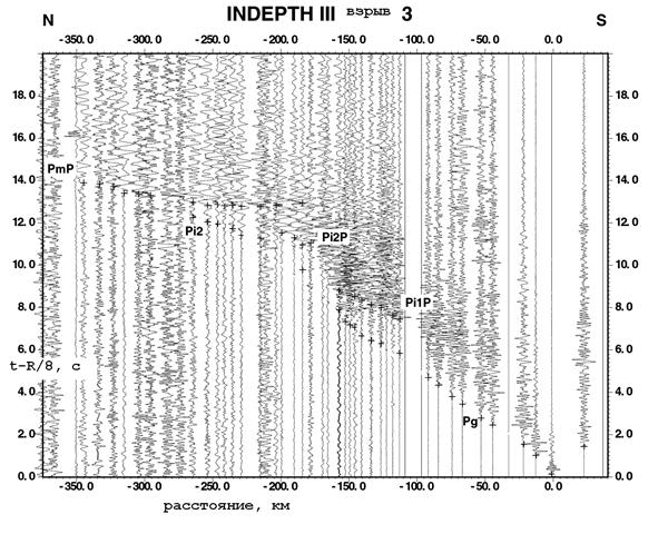Рис.5.2 Наблюденные годографы - это ломаная линия с вершинами в точках, где зарегистрированы времена первых вступлений (пики) (рис. 5.3). Мы представляем годограф как непрерывную линию, а не как отдельные пики. Это связано с тем, что алгоритм является автоматическим и предусматривает вычисление производных. При таком представлении годографов зоны тени проявляются как участки с пониженной кажущейся скоростью. Такие же участки могут существовать на годографах и в случае существования в разрезе вертикальных блоков с пониженной скоростью. Эти случаи разделяются автоматически при вычислении скоростного разреза в случае достаточной системы наблюдений (более чем два встречных годографа). Мы произвели линейную интерполяцию наблюденных годографов в отношении приемников с шагом 4 км. Мы используем наблюденное временное поле (поле изолиний равных удалений источник-приемник с шагом между изолиниями 4 км) для интерполяции годографов между источниками. Были вычислены годографы с источниками, расположенными с постоянным шагом 12 км (рис. 5.4). Эти годографы использованы для обращения методом однородных функций. Рис. 5.3 Наблюденный временной разрез. Временной разрез с редукцией 8 км/с изображен на рис. 5.4 с осью времен, направленной вниз. Плотность изолиний пропорциональна кажущейся скорости. Области с высокой плотностью изолиний соответствуют областям с высокой кажущейся скоростью и области с низкой плотностью изолиний отвечат областям с низкой кажущейся скоростью. Линии изменения плотности изолиний могут рассматриваться как границы раздела слоев. мы выделяем эти черты на качественном уровне и только для сравнения с окончательным глубинным разрезом. Следующие слои и зоны могут быть качественно выделены на наблюденном временном поле. На временах ниже 2 – 3 с, изолинии свидетельствуют о присутствии скоростных слоев с ненарушенной субгоризонтальной слоистостью. К югу от BNS крупная область с повышенной кажущейся скоростью прослеживается на временах 2 – 5 с, а к северу от BNS мощность этой области уменьшается и она трассируется приблизительно на временах 4 – 5 с. ля Кровля средней коры ограничивает эту область снизу. Мощная область с низкой кажущейся скоростью следится на временах от 5 до 8 с. Шов BNS трассируется в средней коре приблизительно на временах от 5 до 11 с. Он отделяет область с уменьшенной скоростью на юге от области с относительно высокой скоростью в северной части разреза. Несколько границ может быть выделено на временах от 8 до 11 с. Вблизи кровли нижней коры небольшой волновод прослеживается. Нижняя кора выделяется на временах около 11 с как область с высокой плотностью изолиний (рис. 5.4) . Рис. 5.4