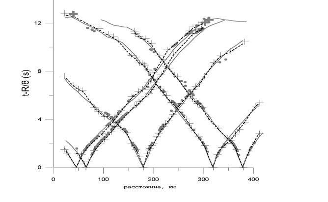 нового глубинного разреза Тонкие непрерывные линии - это теоретические годографы для Zhao et al. модели. Хотя теоретические годографы, приведенные в Zhao et al. (2001) являются непрерывными линиями, им отвечает огромный разрыв в глубинной модели. Ни один луч не имеет точек поворота на глубинах от 10 до 35 км для этой модели. Иными словами, лучи, которые сформировали теоретические годографы до времен 11 с, не проникают глубже 10 км. Кроме того, как видно из рис. 5.3, времена, рассчитанные для нового глубинного разреза, лучше согласуются с наблюденными годографами в отношении значений кажущейся скорости, чем теоретические годографы для Zhao модели.