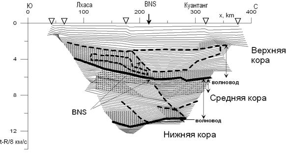 Новые структуры региона получены в результате интерпретации первых вступлений сейсмических преломленных волн по профилю INDEPH III в Центральном Тибете. Метод обращения есть численное обобщение формулы Герглотца-Вихерта на случай 2-мерно неоднородной среды – метод однородных функций. Новый разрез показывает, что сутура BNS представляет собой сложный контакт в верхней коре, а в средней коре ее продолжает листрический надвиг, выполаживающийся на кровле нижней коры, которая приподнята в северной части разреза до глубины 32 км. Ниже кровли средней коры прослеживается слой с пониженной скоростью волн. Средняя кора деформирована и образует наклонные листрические надвиги в южном направлении. В верхней коре южнее BNS выделяются области с повышенной скоростью и градиентом скорости, это, видимо, области развития магматизма. Севернее BNS в верхней коре различаются спокойные очертания структур. Использованные нами входные данные были интерпретированы ранее международным коллективом авторов методом моделирования. Результаты сравниваются и различия объясняются. Ключевые слова: Глубинное сейсмическое зондирование, обратные задачи, Тибет, метод моделирования, метод однородных функций