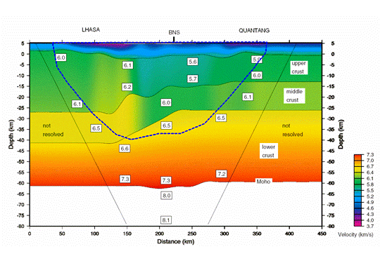 Рис.5.6 Протяженные границы раздела и разломы в новом глубинном разрезе превышают разрешение модели (2.5 х 0.6 км), они четко видны на разрезе, представленном как поверхность с освещенным рельефом и практически однозначно сопоставляются с границами раздела и разломами, которые видны в наблюденном временном поле равных удалений (на рис. 5.4). Геологическая интерпретация нового разреза. Новый разрез для профиля INDEPTH III с геологической интерпретацией приведен на рис. 5.6. Высокоградиентный осадочный слой располагается в верхней части разреза. В районе блока Лхаса его мощность составляет около 7 км, в районе Киангтанг 5 км. Резкая инверсионная граница км отделяет осадочный слой от кровли консолидированной коры. Кровля консолидированной коры практически располагается на глубинах 5-7 км Сложный структурный раздел BNS (Бангонг-Нужианг шов) отделяет верхнюю кору блока Лхаса от верхней коры блока Киангтанг. Верхняя кора террейна Лхаса в новом разрезе содержит два субгоризонтальных слоя на глубине 7 -18 км и имеет повышенную скорость (6.4 км/с вблизи подошвы). Эти слои могут относится к изверженным породам, которые залегают в этой области, как известно из геологических данных. Верхняя консолидированная кора Киангтанг блока также разделяется на два слоя с относительно низкой скоростью и скоростным градиентом. Верхний слой образует хорошо выраженную депрессию до глубины 12 км. Кровля средней коры - это криволинейная кровля слоя с пониженной скоростью, выделенная на глубинах 15-20 км мощностью около 5 км. Скорость падает от 6.2 до 5. км/с на кровле слоя. Мощность слоя с низкой скоростью переменна и увеличивается с севера на юг от значений 3 до 9 км. Относительно существования волновода в работе Zhao et al (2001) утверждается, что не имеется очевидных свидетельств существования среднекорового волновода в данных продольных волн, хотя эти данные не противоречат существованию такого слоя. Наши результаты отчетливо говорят о существовании волновода и хорошо согласуются с данными Zhi Min and Wu, (1987), где указывается, что в районе структурного шва BNS в Тибете интерпретация P и S волн приводит к выводу о существовании низкоскоростной зоны на глубинах от 10 до 20 км. Главный надвиг (BNS) имеет вид листрического надвига в средней коре со смещением около 3.5 км и протяженностью 10 км, что превышает размер ячейки поля скорости. Он делит нижнюю и среднюю кору на две части. Другой надвиг того же направления идентифицируется к северу от BNS.Средняя кора Киангтанг блока имеет повышенный градиент скорости и пониженную мощность по.сравнению с блоком Лхаса. Южнее BNS средняя кора включает пододвинутый блок, чья южная граница может быть трассирована по изменению наклона скоростных изолиний. Несколько субгоризонтальных инверсионных разрывов относительно короткой протяженности и идентичного наклона могут быть прослежены в обоих блоках. Различие может свидетельствовать о различном вещественном составе средней коры блоков Лхаса и Киангтанг. По геологическим данным блоки Лхаса и Киангтанг являются террейнами. Это может быть надвиг блока Куангтанг на блок Лхаса. Средняя кора прослеживается до глубин от 40 км на юге до 28 км на севере. Скорость вблизи подошвы средней коры составляет около 6.4 км/с. Нижняя кора прослежена до глубины 48 км. Скорости в ней увеличиваются с глубиной от 6.4 до 6.8 км/с. Нижняя 