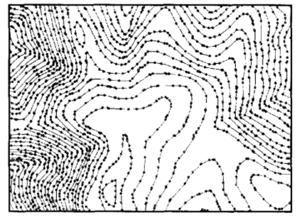 Рис. 7. Плотность точек в модели GRID TGRID (triangulated grid) – модель, сочетающая в себе элементы моделей TIN и GRID. Такие модели имеют свои преимущества, например, позволяют использовать дополнительные данные для описания сложных форм рельефа (обрывы, скальные выступы). Восстановление поверхностей реализуется на основе интерполяции исходных данных. Интерполяция – восстановление функции на заданном интервале по известным ее значениям конечного множества точек, принадлежащих этому интервалу. В настоящее время известны десятки методов интерполяции поверхностей, наиболее распространенные: линейная интерполяция; метод обратных взвешенных расстояний, кригинг; сплайн-интерполяция; тренд-интерполяция. Кригинг. Метод интерполяции, который основан на использовании методов математической статистики. В его реализации применяется идея регионализированной переменной, т.е. переменной, которая изменяется от места к месту с некоторой видимой непрерывностью, поэтому не может моделироваться только одним математическим уравнением. Поверхность рассматривается в виде трех независимых величин. Первая - тренд, характеризует изменение поверхности в определенном направлении. Далее предполагается, что имеются небольшие отклонения от общей тенденции, вроде маленьких пиков и впадин, которые являются случайными, но все же связанными друг с другом пространственно. Случайный шум (например, валуны). С каждой из трех переменных надо оперировать в отдельности. Тренд оценивается с использованием математического уравнения, которое наиболее близко представляет общее изменение поверхности, во многом подобно поверхности тренда.