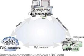 В состав ГИС-сети входят три основных строительных блока: · Порталы каталогов метаданных, где пользователи могут провести поиск и найти ГИС-информацию в соответствии с их потребностями · ГИС-узлы, где пользователи компилируют и публи куют наборы ГИС-информации · Пользователи ГИС, которые ведут поиск, выявляют, обращаются и используют опубликованные данные и сервисы