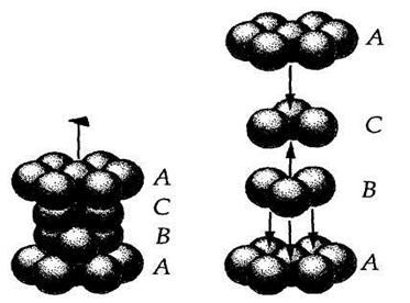 Однако при наложении шаров второго слоя одни лунки (1) оказываются сквозными (т. е. над ними нет шаров второго слоя В), другие (2) — несквозными (прикрыты шарами второго слоя) (рис. 7.7.). Это создает два варианта наложения шаров третьего слоя. В первом случае заполнение несквозных лунок (2) приведет к тому, что уже третий слой расположится над первым, четвертый — над вторым и т. д. В результате полученная упаковка плотнейших слоев окажется двухслойной и запишется как чередование двух букв АВ АВAВ... — слоев А и В (рис. 7.8. б). Во втором случае если шары третьего слоя (С) укладывать в сквозные лунки (1), то повторение наступит на четвертом слое, и закономерность чередования уже трех независимых слоев в этом случае в буквенном обозначении запишется как ABC ABC... (рис. 7.9).