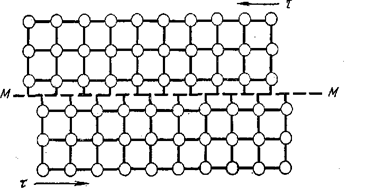 Рис. 9.3 Сдвиг верхней части кристалла относительно нижней одновременно по всей плоскости ММ В додислокационной теории скольжение представлялось в виде одновременного смещения всех атомов одного слоя по отношению к атомам соседнего слоя (рис. 9.3), т. е. так, как скользят соседние карты в колоде. При этом приложенная сила должна быть достаточной, чтобы преодолеть взаимное притяжение между всеми граничными атомами из соседних слоев. Оценим порядок величины критического скалывающего напряжения, соответствующего этой модели скольжения. Рассмотрим две соседние атомные плоскости I и II (рис.9.4) с межплоскостным расстоянием а. При смещении плоскости / относительно плоскости // в направлении, указанном стрелкой b, каждый атом смещающейся плоскости периодически, после продвижения на величину b, попадает, в равновесные положения, неотличимые от исходных. В положениях равновесия (узлах решетки) энергия атомов минимальна, а при смещении плоскости / из положения равновесия на расстояние b/2 эта энергия достигает максимума.