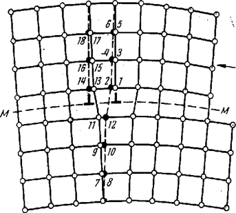 Рис. 9.5 Смещения атомов при скольжении краевой дислокации справа налево на одно межатомное расстояние. Атомы в новых положениях находятся на пунктирных линиях Чтобы дислокация из исходного положения 1 переместилась в соседнее положение 14, не нужно сдвигать всю верхнюю половину кристалла на одно межатомное расстояние. Достаточно, чтобы произойти следующие перемещения атомов: атом 1 в положение 2, 3 в 4, 5 в 6, 7 в 8, 9 в 10, 11 в 12, 13 в 14, 15 в 16 и 17 в 18. Аналогичным образом смещаются атомы не только в плоскости чертежа, но и во всех атомных слоях, параллельных этой плоскости. Незначительные перемещения атомов в области несовершенства (дислокации) приводят к перемещению самой дислокации на одно межатомное расстояние. При этом целая плоскость 7—17 разрывается на две части. Ее нижняя часть объединяется с исходной экстраплоскостью в целую плоскость 8—6, а верхняя превращается в новую экстраплоскость 14—18. Под действием касательных напряжений дислокация перемещается в плоскости скольжения ММ путем указанных выше перемещений атомов. Такое движение ее называется скольжением или консервативным движением. На рис. 9.5 показаны краевая дислокация внутри кристалла и ступенька на его правой боковой грани, образовавшаяся в результате сдвига справа налево верхней части кристалла относительно нижней, причем зафиксирован момент, когда сдвиг еще не произошел в потенциальной плоскости скольжения левее дислокации. Если под действием сдвигающей силы дислокация будет скользить справа налево, то сдвиг будет охватывать все большую часть плоскости скольжения. Когда дислокация выйдет на левую боковую грань кристалла, здесь образуется ступенька. На рис. 9.6 показаны разные положения дислокации при ее скольжении. Пунктиром отмечена часть кристаллографической плоскости, в которой уже произошел сдвиг на одно межатомное расстояние. Ступеньки величиной в одно межатомное расстояние на правой и левой гранях кристалла, образовавшиеся в результате пробега одной дислокации справа налево через весь кристалл, могли бы явиться следствием сдвига всей верхней части как единого целого по отношению к нижней части кристалла.