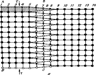 Схема атомного механизма перемещения винтовой дислокации показана на рис.9.11. Расположение атомов, соединенных сплошными линиями на рис.9.11, а, такое же, как и на рис.9.10,а. Плоскость скольжения ABCD совпадает с плоскостью чертежа, черные кружки обозначают атомы под плоскостью чертежа, а белые — над ней Верхняя стрелка обозначает сдвигающие напряжения, действующие на ту часть кристалла, которая находится над плоскостью чертежа, а нижняя стрелка — напряжения, действующие на часть кристалла под этой плоскостью. Заштрихована ступенька, возникшая при сдвиге на верхней грани кристалла (рис. 9.9). Область несовершенства, внутри которой атомы образуют винтовую лестницу, находится между атомными рядами 5 и 7. Пунктирные линии соединяют атомы после перемещения (скольжения) винтовой дислокации на один период решетки вправо. Если в исходном положении область несовершенства находилась между атомными рядами 5 и 7, то после смещения на один период решетки вправо она находится между атомными рядами 6 и 8.