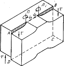 Рис. 9.8. Сдвиг, создавший винтовую дислокацию: а — кристалл до сдвига надрезан по ABCD; б — кристалл после сдвига; ABCD — зона сдвига Сделаем в кристалле надрез по плоскости ABCD (рис. 9.8, а) и сдвинем правую (переднюю) часть кристалла вниз на один период решетки (рис. 9.8, б). Образовавшаяся при таком сдвиге ступенька на верхней грани не проходит через всю ширину кристалла, оканчиваясь в точке b. Простая кубическая решетка в рассматриваемом случае выглядит так, как показано на рис. 9.9. У переднего края кристалла (вблизи точки А) сдвиг произошел ровно на один период решетки так, что верхняя атомная плоскость справа от точки А сливается в единое целое со второй сверху плоскостью слева от точки А. Так как надрез ABCD дошел только до середины кристалла, то правая часть кристалла не может целиком сдвинуться по отношению к левой на один период решетки. Величина смещения правой части по отношению к левой уменьшается по направлению от точки А к точке В.