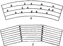 Рис. 16.4. Схема полигониуации: а — хаотическое расположение краевых дислокаций в изогнутом кристалле; б — вертикальные стенки из дислокаций после полигонизации