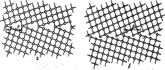 Рис. 16.9. Наклонная граница 37° <001> между зернами с кубической решеткой в положении совпадения (а) и после жесткой релаксации (б)