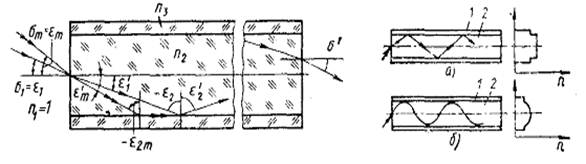 Показники заломлення серцевини й оболонки позначені n2 і п3, кути падіння й заломлення променя на вхідному торці Залежно від матеріалів серцевини й оболонки розрізняють світловоди: скляні (серцевина й оболонка зі скла), склополімерні (серцевина зі скла, оболонка із пластмаси), полімерні (серцевина із пластмаси, оболонка з інших матеріалів), кварцові (серцевина із кварцу). Існують інфрачервоні світловоди, серцевина яких прозора для ІЧ-випромінювання. Для пропускання випромінювання в УФ-, видимому й ІЧ-діапазонах використовують поліхроматичні світловоди, прозорі в спектральному діапазоні 0,18 - 5 мкм. Розрізняють ступінчаті (рис. 1.52 а) і градієнтні (рис. 1.52 б) світловоди. У ступінчатих світловодах, виконаних з матеріалу з постійним показником заломлення, світлові промені поширюються по траєкторії, що представляє собою ламану лінію. Показник заломлення градієнтних світловодів, називаних граданами або селфоками, плавно зменшується від центра до краю, внаслідок чого промені, що поширюються уздовж світловода, мають плавну траєкторію. Перевагою граданів у порівнянні зі ступінчатими світловодами є зменшення розсіювання світла внаслідок відсутності різкої границі розділення світловода із середовищем. Поперечний переріз світловодів може мати круглу, прямокутну, шестигранну й іншу більше складну форму. Залежно від упорядкованості укладання пучків волокон на вхідному й вихідному торцях розрізняють світловоди регулярні, призначені для передачі зображення, і нерегулярні — для передачі потоку випромінювання. Для круглих волокон використають квадратне укладання (центри волокон утворять квадрати, рис.1.53 а), гексагональне укладання (центри волокон перебувають у вершинах рівносторонніх трикутників, рис. 1.53 б).