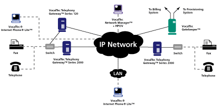 · Общий принцип действия телефонных серверов IP-телефонии таков: с одной стороны, сервер связан с телефонными линиями и может соединиться с любым телефоном мира. С другой стороны, сервер связан с Интернетом и может связаться с любым компьютером в мире. Сервер принимает стандартный телефонный сигнал, оцифровывает его (если он исходно не цифровой), значительно сжимает, разбивает на пакеты и отправляет через Интернет по назначению с использованием протокола Интернет (TCP/IP). Для пакетов, приходящих из Сети на телефонный сервер и уходящих в телефонную линию, операция происходит в обратном порядке. Обе составляющие операции (вход сигнала в телефонную сеть и его выход из телефонной сети) происходят практически одновременно, что позволяет обеспечить полнодуплексный разговор. На основе этих базовых операций можно построить много различных конфигураций. Допустим, звонок телефон-компьютер или компьютер-телефон может обеспечивать один телефонный сервер. Для организации связи телефон(факс)-телефон(факс) нужно два сервера.