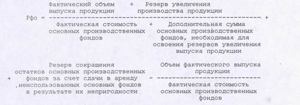 - Качественный анализ состояния основных фондов и их использования дает возможность оценить эффективность применения активной и пассивной частей средств труда и на их основе произвести расчет резервов увеличения выпуска продукции и фондоотдачи. При расчете резервов роста выпуска продукции за основу берется не плановый уровень факторных показателей, а возможный. Для определения резерва увеличения выпуска продукции за счет повышения коэффициента сменности при улучшении организации производства необходимо умножить показатель возможного прироста коэффициента сменности на возможное количество дней работы всего оборудования, а также на фактическую сменную выработку (или фактическую среднюю продолжительность смены) и фактическую среднечасовую выработку оборудования. При определении резерва увеличения выпуска продукции за счет сокращения целодневных простоев оборудования необходимо умножить прирост среднего количества дней работы оборудования на возможное количество единиц оборудования, фактическую среднедневную выработку каждой единицы оборудования или на фактический коэффициент сменности, фактическую продолжительность смены и фактическую среднечасовую выработку. Для расчета резерва увеличения выпуска продукции за счет ввода в действие нового оборудования следует умножить дополнительное количество введенного в действие нового оборудования на фактическое количество дней работы за год единицы оборудования, фактический коэффициент сменности, фактическую среднюю продолжительность смены, фактическую среднечасовую выработку. При расчете увеличения выпуска продукции за счет сокращения внутрисменных потерь рабочего времени необходимо умножить показатель возможного прироста средней продолжительности смены на фактический уровень среднечасовой выработки оборудования и возможное количество отработанных смен всем оборудованием или путем перемножения возможного количества оборудования, возможного количества дней, отработанных единицей оборудования, и возможного коэффициента сменности. Для определения резерва организации увеличения выпуска продукции за счет роста среднечасовой выработки оборудования необходимо выявленный резерв по увеличению среднечасовой выработки умножить на возможное количество часов работы оборудования, то есть умножить возможное количество единиц оборудования на количество дней работы, на коэффициент сменности и на продолжительность смены. Одним из резервов увеличения выпуска продукции является рост фондоотдачи, который способствует увеличению объема производства и сокращению среднегодовых остатков основных производственных фондов. Резерв роста фондоотдачи определяется следующим образом:
