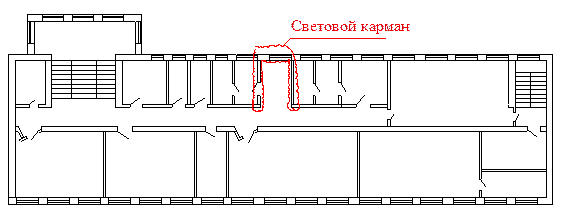 2.3 Эвакуация людей при пожаре. Освещение естественное должны иметь: - жилые комнаты, - лестничные клетки, - общие коридоры в жилых домах коридорного типа и т.п. Длинна общих коридоров не должна превышать при освещении через световые проемы в наружных стенах: - в одном торце – 24 м, - в двух торцах – 48 м. Если это не выполняется, то необходимо устраивать световой карман. Через световой карман (которым может служить и лестничная клетка) допускается освещать коридор до 12 метров с каждой стороны.