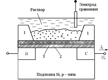 Рис. 9. Схематическое изображение pH - чувствительного полевого транзистора и БСС на его основе: Si - кремниевая подложка p - типа, И, С - зоны истока и стока; 1- изолирующее покрытие, 2 - диэлектрик из двуокиси кремния; 3 - химически чувствительная мембрана, 4 - иммобилизованный БО; I c, U 3, U c - ток стока, подаваемые потенциалы затвора и стока