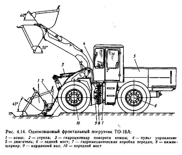 Силовая установка погрузчика состоит из дизеля А-01МД и редуктора отбора мощности, установленного на дизеле. Погрузчик имеет две полурамы – переднюю и заднюю. Их взаимное расположение и установки мостов показаны на рис 1.6. Рабочее оборудование – ковш 1 (рис 4.14) и стрела 2 – аналогичное оборудование погрузчика ТО-6А, размещенного на передней полураме. Передний 10 и задний 6 мосты ведущие, неповоротные, унифицированные (У221003). Некоторые детали и узлы главной передачи и дифференциала моста У221003 и заднего моста автомобиля МАЗ-500 взаимозаменяемы. Передний мост установлен на двух штифтах и прикреплён болтами к передней полураме. Подвеска заднего моста обеспечивает его качание вместе с балансирной рамой в вертикальной плоскости, что позволяет разгрузить заднюю полураму от поперечных нагрузок. Для ограничения угла поворота рамы и снижение динамических ударов в конце поворота на ней установлены амортизирующие резиновые буфера.