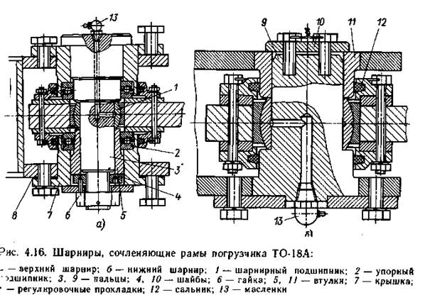 Шарнирное соединение передней 1 и задней 3 полурамы (рис 4.15) выполнено с помощью двух соосно расположенных шарниров верхнего 2 и нижнего 4.