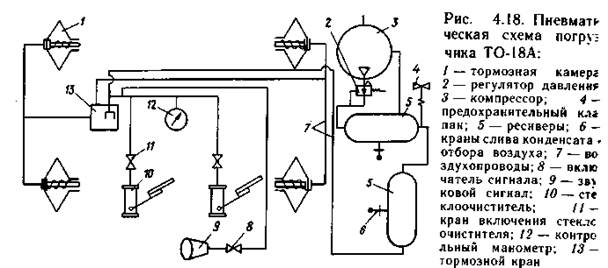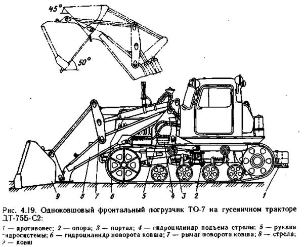 Погрузчик имеет пневматическую систему (рис 4.18), которая обеспечивает питание тормозных камер 1, стеклоочистителей 10 и звукового сигнала 9. У погрузчика две системы колодочных тормозов. Ножной пневматический тормоз предназначен для торможения движущегося погрузчика, ручной тормоз имеет гидравлический привод и предназначен для затормаживания погрузчика на стоянках и кратковременно при выходе из строя ножных тормозов. Ножной тормоз состоит из четырёх колёсных тормозов, пневматического привода, привода управления тормозными клапанами 13. Две тормозные педали, установленные в кабине водителя, через систему тяг действуют на тормозной кран пневматического привода. Педали установлены на одной оси и соединены между собой так, что при нажатии на правую педель, левая остаётся неподвижной, а при нажатии на левую срабатывают обе педали. Левая педаль через тягу связана с разобщительным клапаном гидромеханической коробки передач, правая через тягу - с тормозным краном. Для возврата педалей в исходное положение предусмотрены оттяжные пружины. Тормоза колёс барабанные с внутренними разжимными колодками. Ручной тормоз установлен на редукторе, прикрепленном с левой стороны к картеру коробки передач. Компрессор 3, установленный на погрузчике поршневой двухцилиндровый. Привод компрессора осуществляется клиноременной передачей от дополнительного шкива, установленного на коленчатом валу двигателя. Погрузчик имеет электрооборудование автомобильного типа, предназначенное для электростартерного пуска пускового двигателя, освещения дороги и участка работ, рабочих органов, кабина и щитка приборов в ночное время, а также для привода вентилятора, отопления кабины и предпускового подогревателя. Одноковшовый фронтальный погрузчик ТО-7 на гусеничном тракторе ДТ-75Б-С2 (рис 4.19) и ТО-10А на гусеничном тракторе Т-130ПГ имеют рабочее оборудование, идентичное с колёсным погрузчиком. Оно смонтировано на портале 3, который прикреплён болтами и пальцами к опорам, приваренным к основной раме трактора. Для устойчивости эти погрузчики снабжены противовесом 1, а тракторы ходоуменьшителем. В последнее время появились гусеничные погрузчики с задним расположением двигателя с объёмным гидроприводом передвижения.