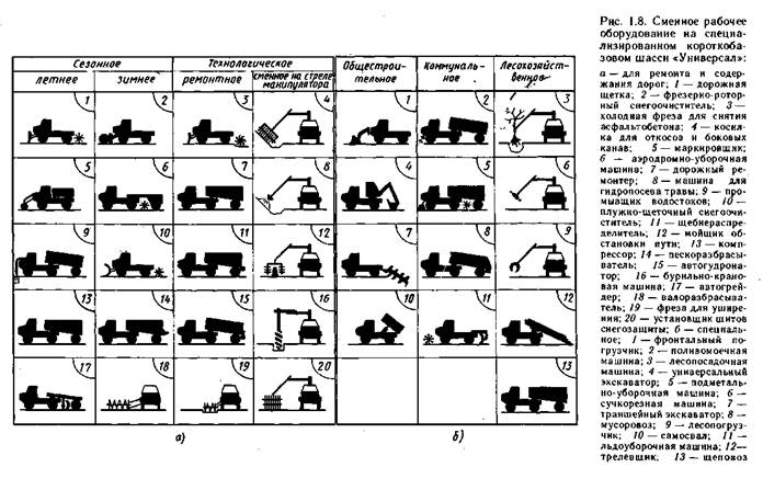 Автомобильные шасси широко применяют для монтажа на них различного дорожно-строительного и вспомогательного оборудования: кранов, экскаваторов, бетономешалок, цементо и бетоновозов, поливочно-моечных и подметально-уборочных машин, походных мастерских, компрессоров, электростанций и др. Шасси грузовых автомобилей должны удовлетворять следующим требованиям: I) иметь ходоуменьшители для выполнения определенных технологических операций - распределения на дороге вяжущих материалов (битума и цемента), поливки и мойки покрытии и др.; 2) при наличии тяжелого кранового и экскаваторного оборудования рама и ходовое оборудование шасси должны быть усилены; 3) шасси автомобилей должны иметь укороченную базу и седельное устройство для: улучшения маневренности и работы с полуприцепами, цистернами, грейдерами; 4) иметь возможность отбора мощности спереди и сзади шасси для привода рабочих органов машины. Примером такого специализированного шасси, которое можно оборудовать различными сменными механизмами, является короткобазовое шасси («Универсал») высокой проходимости со всеми ведущими колесами и с мостами портальной конструкции, допускающими повышенный дорожный просвет до 450 мм. Расположение коробки передач и двигателя смещено вправо от оси по ходу движения машины, что обеспечивает низкое расположение центра тяжести, удобную посадку водителя и хороший обзор. Шасси имеет дизель мощностью 88—110кВт (120—150л.с.) при; частоте вращения коленчатого вала, равной 2200об/мин. Коробка передач с мультипликатором обеспечивает диапазон транспортных скоростей до 85 км/ч; рабочих 1 - 10км/ч и ползучих 0,1 - 1км/ч. Независимый отбор мощности до 80 %, минимальный радиус поворота 7,5м; мосты обеспечивают одинаковую грузоподъемность по 5т. Платформа опрокидывается гидроподъемником на три стороны. На специализированном шасси можно монтировать до 50 видов различного рабочего оборудования спереди, сзади и с боков, для чего в соответствующих местах имеются валы отбора мощности от коробки передач, а также необходимая гидросистема. При полной грузоподъемности 10т на скорости 3км/ч шасси развивает тяговое усилие 50кН и может преодолевать подъемы свыше 30°. Различное сменное оборудование используют на строительных и дорожных, сельскохозяйственных, лесозаготовительных работах, а также широко применяют для содержания и ремонта дорог в летнее и зимнее время (рис. 1.8).