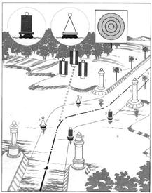 Прямолинейный участок судоходного канала с паромной переправой и аварийными (заградительными) воротами в темное время суток показан на рис. 7. Навигационное оборудование небольших озеровидных бьефов или водохранилищ между отдельными гидроузлами такое же, как и на реках. Оно состоит из линейных и щелевых створов и кромочных плавучих знаков. Такой участок канала с водохранилищем показан на рис. 8. Навигационное оборудование однониточного шлюза и подходов к нему показано на рис. 9. На стенках камеры шлюза расположены знаки (огни) «Стоп» 9, обозначающие полезную длину камеры. На выходе из камеры шлюза установлены светофоры 8, регулирующие выход судов из шлюза, которые обычно располагают вблизи пульта 10 управления шлюзом. Громкоговоритель 2 служит для сообщений, подаваемых с пульта диспетчера. Вблизи верхней и нижней голов шлюза со стороны входа в камеру устанавливаются входные светофоры 6. Стоповый знак 5, расположенный на стенке причальных палов, обозначает границу предельного приближения судна при одностороннем шлюзовании, а стоповый знак 4 — при двухстороннем шлюзовании. Разрешение на подход судна к камере шлюза регулируется светофором 3, а на подход к причальным палам (причалу) — светофором дальнего действия 1. Имеются сигнальные огни 7 на воротах некоторых шлюзов.
