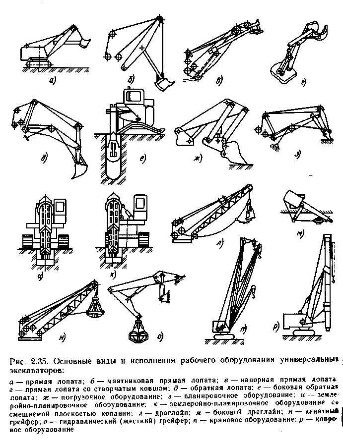 У маятниковой прямой лопаты рукоять совершает только маятниковые движения относительно стрелы (рис. 2.35б), а напор ковша при копании осуществляется одновременным опусканием стрелы. Напорная прямая лопата имеет приводное устройство для напорного движения рукояти (рис. 2,35в) Прямая лопата со створчатым ковшом может разрабатывать грунт при смыкании створок ковша, поворачивающихся в плоскости, перпендикулярной плоскости поворота рукояти. Рабочее оборудование для разработки грунта ниже уровня стоянки с укрепленным на рукояти ковшом, копающим в направлении к экскаватору, называют обратной лопатой (рис 2.35д). Боковая обратная лопата (рис 2.35с) предназначена для работы в стесненных условиях с ковшом, копающим в вертикальной плоскости, смещенной относительно вертикальной оси вращения поворотной платформы или относительно продольной оси базовой машины. Рабочее оборудование, из узлов которого может быть смонтирована прямая или обратная лопата, называется универсальной лопатой. Погрузочный ковш (рис 2.35ж) служит для погрузки сыпучих и кусковых материалов. Ковш заполняется напорным усилием с одновременным поворотом при его движении от экскаватора или с одновременным перемещением экскаватора. Погрузочный ковш имеет в 2-3 раза большую вместимость по сравнению с прямой лопатой для одной и той же модели экскаватора, что позволяет существенно повысить его производительность на погрузочных работах. Планировочное оборудование в виде уширенного ковша или отвала бульдозерного типа монтируют на универсальной стреле экскаватора (рис 2.35з.) для послойной разработки грунта, планировки откосов, насыпей и выемок в различных плоскостях. Для специальных планировочных работ с рабочим органом, который укрепляют обычно на телескопической стреле изменяющей при работе свою длину и поворачивающейся в вертикальной и горизонтальной плоскостях по отношению к своей продольной оси. Выпускают специальные экскаваторы – планировщики (рис 2.35и) с различными рабочими органами для земляных и планировочных работ. Для работы в стесненных условиях и для бокового выноса рабочего органа применяют стрелу с шарнирной опорой, которая может смещаться поперек поворотной части (рис 2.35к) Драглайн (рис 2.35л), применяют при разработке грунта ниже уровня стоянки экскаватора. Глубина копания, высота разгрузки ковша и расстояние, на которое может быть заброшен ковш драглайна, значительно больше, чем у прямой и обратной лопаты. Поэтому драглайн используют для рытья сравнительно больших котлованов и траншей, а так же для отсыпки насыпей, в частности на строительстве каналов, автомобильных и железных дорог, для мелиоративных и гидротехнических работ. Часто для очистки каналов применяют боковой драглайн (рис. 2.35м), с ковшом подвешенным на канатах и копающим под углом к вертикальной плоскости стрелы.